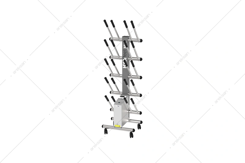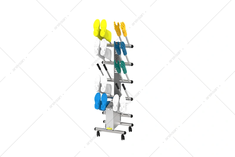 10 çift kapasiteli bot kurutucu, epoksi çelik ve AISI 304L paslanmaz çelik gövdesiyle gıda üretim tesisleri, et işleme ve temiz oda alanlarına yönelik üretilmiştir. Ventilasyon ve ısıtma sistemi 1 saat içinde tam kurutma, kimyasalsız dezenfeksiyon sistemi ise 1,5 saat içinde koku ve mikroorganizma giderimi sağlamaktadır. Bağımsız laboratuvar tarafından test edilmiş etkinlik sertifikasına sahiptir. Tekerlekli mobil yapısıyla farklı alanlara kolayca konuşlandırılabilmektedir.