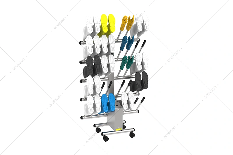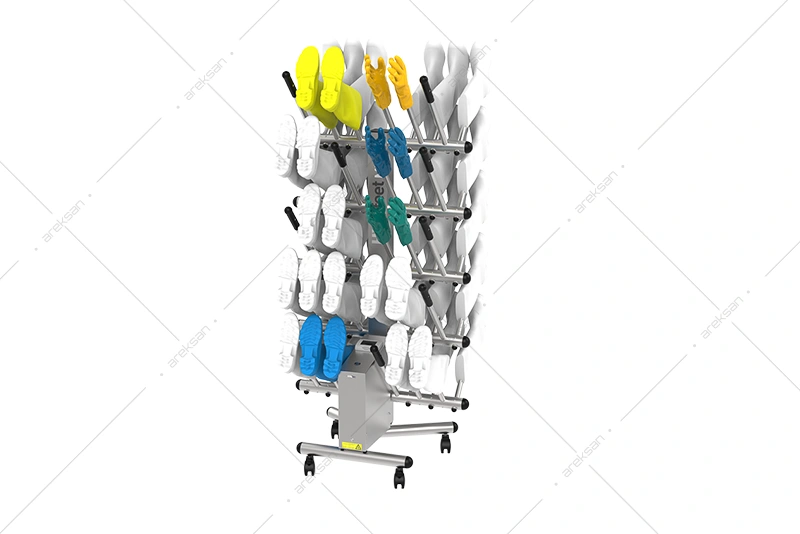 30 çift çift yüzlü paslanmaz bot kurutucu, AISI 304L paslanmaz çelik gövdesiyle gıda üretim tesisleri, et işleme ve temiz oda alanlarına yönelik üretilmiştir. Çift yüzlü yapısı sayesinde aynı taban alanıyla iki kat kapasite sağlamakta, yoğun vardiyalı tesislerde alan verimliliği sunmaktadır. 1100W gücündeki ventilasyon ve ısıtma sistemi 1 saat içinde tam kurutma, kimyasalsız dezenfeksiyon sistemi 1,5 saat içinde koku ve mikroorganizma giderimi sağlamaktadır. Bağımsız laboratuvar tarafından test edilmiş etkinlik sertifikasına sahiptir. Tekerlekli mobil yapısıyla farklı alanlara kolayca konuşlandırılabilmektedir.