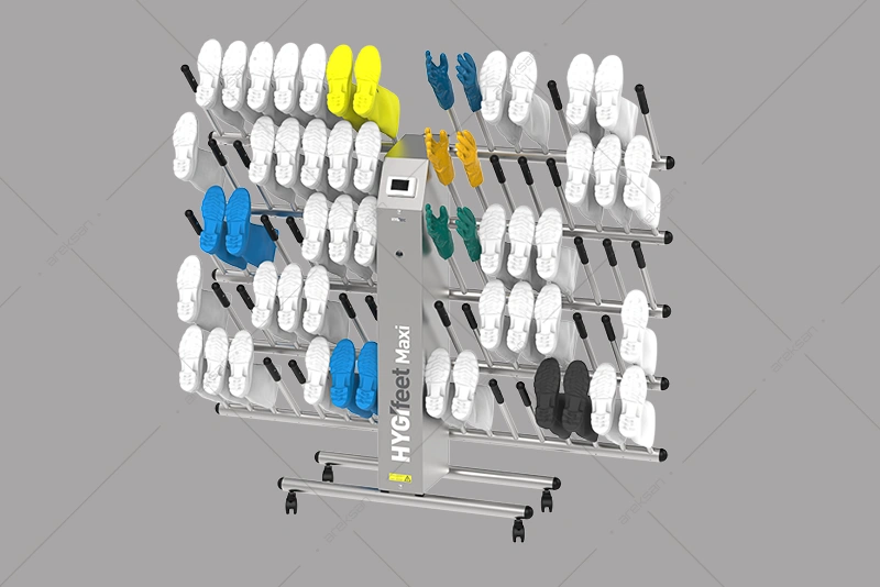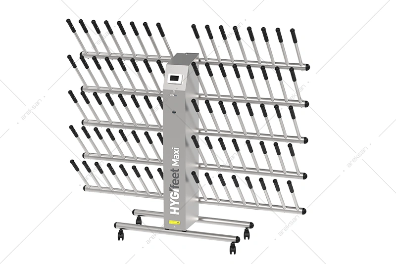 40 Çift Paslanmaz Bot Kurutucu, AISI 304L paslanmaz çelik gövdesiyle gıda üretim tesisleri, et işleme ve temiz oda alanlarına yönelik üretilmiştir. 1100W gücündeki ventilasyon ve ısıtma sistemi 1 saat içinde tam kurutma, kimyasalsız dezenfeksiyon sistemi 1,5 saat içinde koku ve mikroorganizma giderimi sağlamaktadır. Bağımsız laboratuvar tarafından test edilmiş etkinlik sertifikasına sahiptir. Tekerlekli mobil yapısıyla farklı alanlara kolayca konuşlandırılabilmektedir.