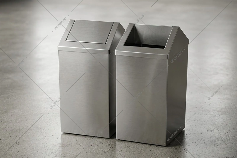 Sallanır kapaklı paslanmaz çelik çöp kovası olarak bu modelin otomatik kapanır kapak sistemi, atık atıldıktan sonra kapağın kendiliğinden kapanmasını sağlamakta; atıkların görünürlüğünü ve kötü koku yayılımını sınırlamaktadır. Kapak mekanizması herhangi bir elektrik veya sensör sistemi gerektirmemekte, mekanik yapısı sayesinde bakım ihtiyacı asgari düzeyde kalmaktadır. Kare gövde yapısı duvar diplerinde ve köşe yerleşimlerinde verimli alan kullanımı sağlamaktadır. Tüm modeller istenilen renk ve yüzey seçenekleriyle proje bazlı üretilmektedir.