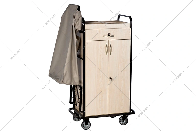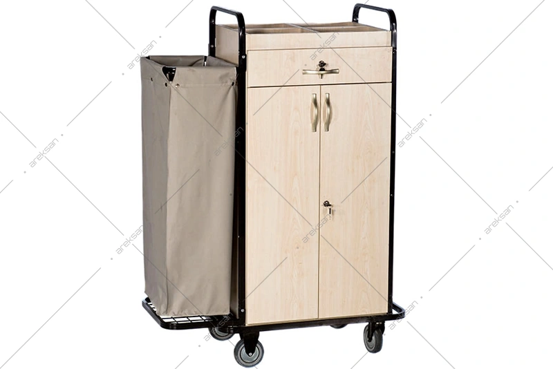 KSA-4 çekmeceli kat arabası, 4 bölmeli açık maid gözü, çekmece ve 1 adet sökülebilir yıkanabilir kirli toplama torbasıyla housekeeping ekiplerinin temizlik malzemelerini düzenli taşımasına yönelik üretilmektedir. 20×20 mm metal profil ve 1 mm et kalınlığındaki gövde yapısı yoğun kullanım koşullarına uygundur.
