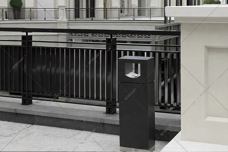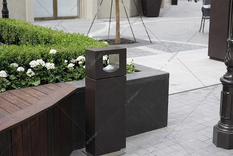 16×30 cm ve 16×20 cm taban seçenekleriyle farklı alan gereksinimlerine uyum sağlar. Paslanmaz çelik taban detayı modern görünümü tamamlar. Dış mekan küllük modeli, projenin renk şemasına ve mimari diline göre özelleştirilebilmektedir.