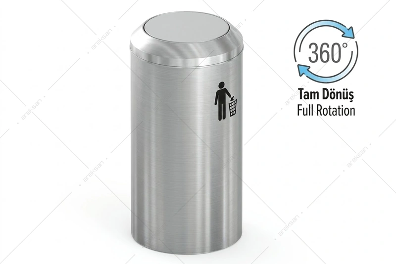 Döner kapaklı paslanmaz çelik çöp kovası, üst kapağının 360° tam dönüş yapan mekanizmasıyla genel kullanım alanlarında atık atımını kolaylaştıran bir modeldir. STB-122, silindirik gövde formu ve fırçalanmış paslanmaz çelik yüzeyiyle otel, iş merkezi ve AVM gibi görsel bütünlüğün ön planda tutulduğu mekânlara uyum sağlamaktadır. Gövde, proje gereksinimlerine göre AISI 304 paslanmaz çelik, 430 paslanmaz çelik veya boyalı yüzey seçenekleriyle temin edilebilmektedir.