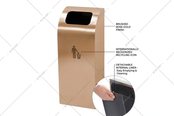 Genel alan çöp kovası modelleri kurumsal iç mekânların farklı alan büyüklüklerine ve kullanım yoğunluklarına göre yapılandırılabilmektedir. Açık ağızlı ve kapaksız modeller yüksek geçiş trafiğine sahip koridorlarda hızlı atık bırakma imkânı sunarken döner kapaklı ve çemberli kapaklı modeller atık görünürlüğünü sınırlayarak mekânın genel görsel düzenine katkı sağlamaktadır. PVD gold, bronz ve siyah kaplama seçenekleriyle üst segment otel ve AVM projelerinde malzeme bütünlüğü sağlanabilmektedir. Yere monte ve duvara monte modeller dar alanlarda zemin kullanımını en aza indirmektedir. Tüm modeller istenilen renk ve yüzey seçenekleriyle proje bazlı üretilmektedir.