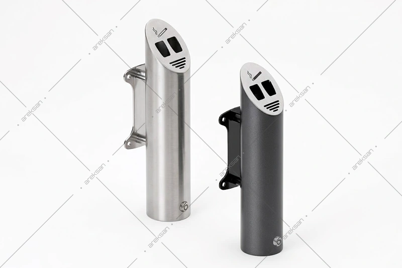 SAB-121 montajlı paslanmaz çelik küllük, yere montajlı ve direğe askılı iki varyantıyla dış mekan projelerinde kullanılmak üzere üretilmektedir. 304 paslanmaz çelik, 430 paslanmaz çelik ve boyalı yüzey seçenekleriyle projenin gereksinimlerine göre yapılandırılabilmektedir.