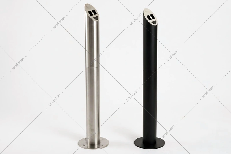 Yere montajlı varyant, 8 cm ve 10 cm çap seçenekleriyle iki farklı hacimde üretilmektedir. Geniş taban plakası zemine sabitlenir, yoğun kullanım alanlarında konum stabilitesi sağlar. Direğe askılı varyant ise mevcut direk ve kolonlara monte edilerek zemin alanı kullanımını en aza indirir; park, bahçe ve yürüyüş aksları için tercih edilmektedir.