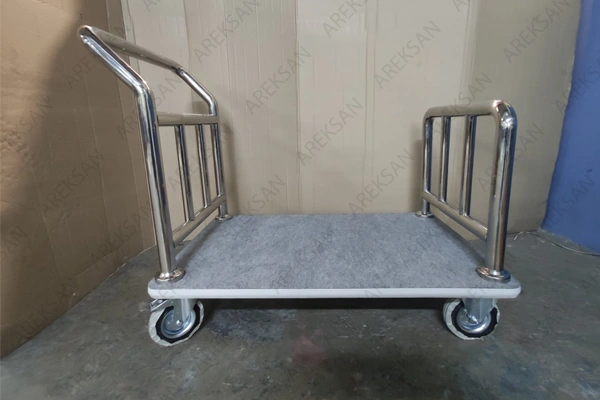 Bellboy arabası Titanyum kaplama yüzeyi, zarif altın tonuyla otel lobinize prestij kazandırırken; sağlam çelik boru yapısı ve sessiz hareket eden tekerlek sistemiyle işlevselliği üst düzeye taşır.