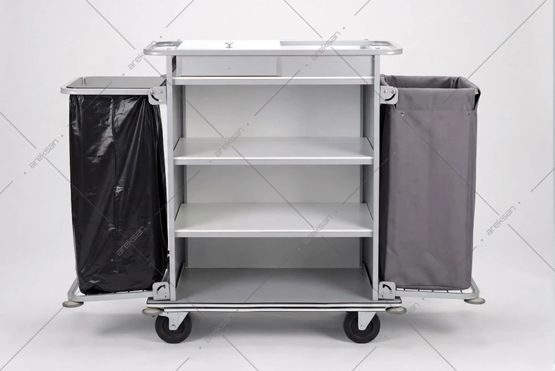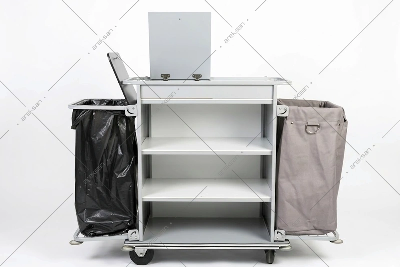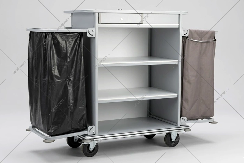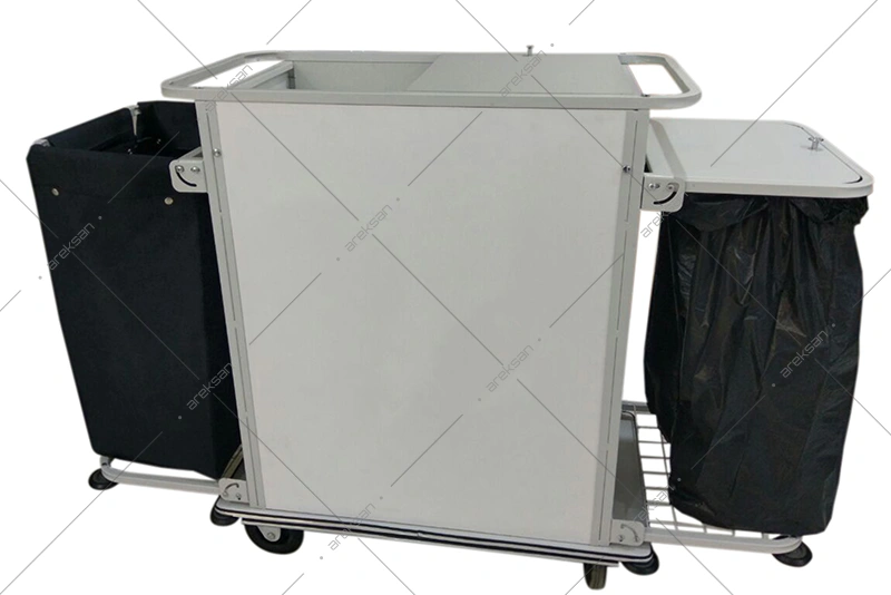 BR-101 Otel Kat Temizlik Arabası Çöp Torbalı, kapaklı maid gözü, yıkanabilir kirli toplama sepeti ve silikon duvar koruyucularıyla housekeeping ekiplerinin temizlik operasyonlarına yönelik üretilmektedir. Demonte yapısıyla proje bazlı temin edilmektedir.