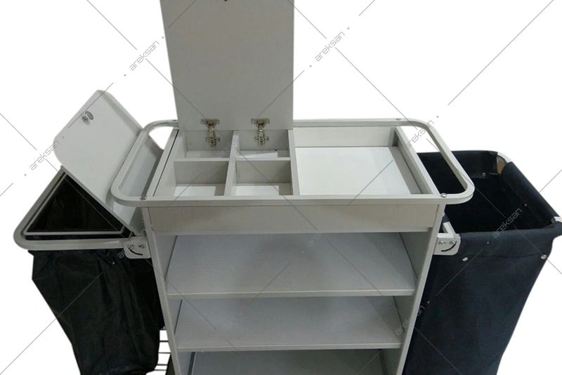 Kapaklı maid gözü temizlik ürünlerinin kapalı bölmede taşınmasını sağlamaktadır. Kapaklı ve değiştirilebilir çöp torbası hijyenik atık yönetimi sunarken yıkanabilir kirli toplama sepeti tekrar kullanıma uygundur. Silikon koruyucular darbe ve sürtünmeye karşı duvar hasarını önlemektedir. Elektrostatik toz boya kaplama paslanmaya karşı dayanımlıdır.