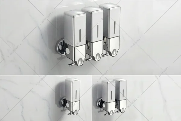 Paslanmaz çelik modeller 304 kalite malzemeden üretilmekte olup kilitli kapak sistemi içerik değişimini yalnızca yetkili personelle sınırlandırır. Her hazne 500 mL kapasiteye sahiptir; tekli, ikili ve üçlü modeller banyo alanının büyüklüğüne ve sunulacak ürün sayısına göre tercih edilir. Gold kaplama modeller aynı teknik özelliklere sahip olup PVD yüzey uygulamasıyla lüks konaklama tesislerinin aksesuar standardına uyum sağlar.