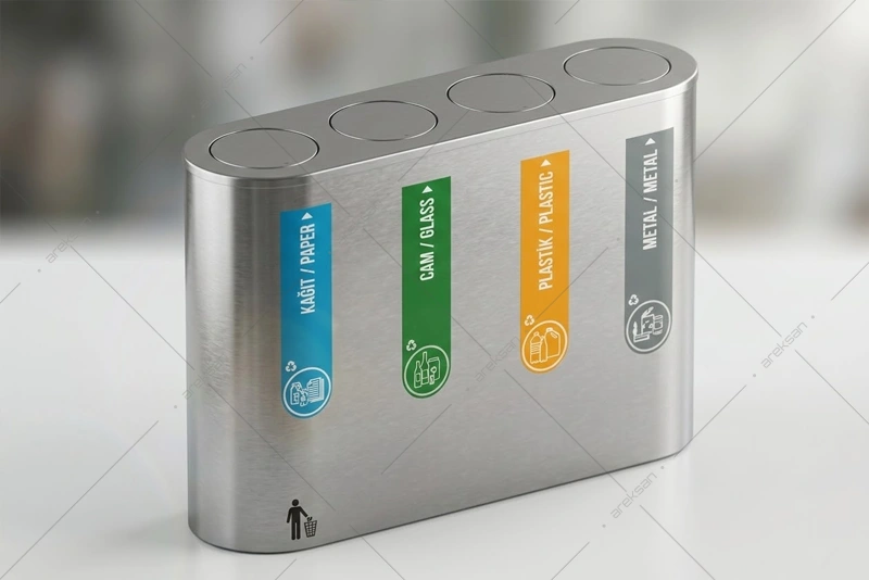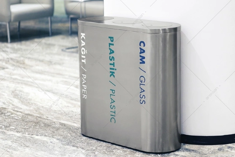 Paslanmaz çelik geri dönüşüm çöp kutusu SRB-106, AISI 304 kalite paslanmaz çelik gövdesiyle iç mekanlarda sıfır atık yönetimi için üretilmiştir. 2’li, 3’lü, 4’lü ve 5’li bölme seçenekleriyle ofislerden kamu alanlarına kadar farklı kapasitelere yönelik kullanım imkânı sunar.