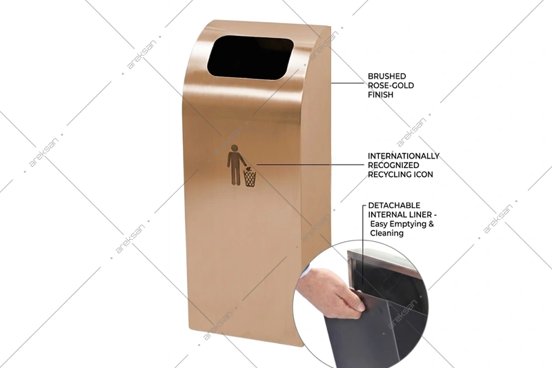 Areksan’dan, oteller, lüks rezidanslar, AVM’ler ve prestijli iş merkezleri için özel olarak tasarlanmış, Rose Gold Çöp Kovası 304 Kalite paslanmaz çelik üzerine PVD Kaplama yapılmaktadır, Gold, Bronz, Siyah veya Krom olarak üretilmektedir.