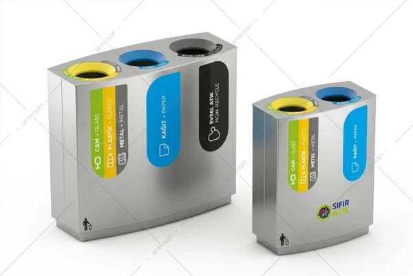 Sıfır atık kutusu modelleri AISI 304 kalite paslanmaz çelikten üretilmekte; renk kodlu bölmeli yapısıyla kâğıt, plastik, cam ve metal atıkların ayrıştırılmasına olanak tanımaktadır. Kapaklı, pedallı, sallanır kapaklı, açılı kapaklı ve sessiz kapanır mekanizmalı seçenekler farklı kullanım yoğunluklarına ve mekân gereksinimlerine göre yapılandırılabilmektedir. Otel odası ölçeğinde kompakt geri dönüşüm kutusu modellerinden kamu kurumu koridoru ölçeğinde büyük kapasiteli atık ayrıştırma sistemlerine kadar her proje tipine uygun model mevcuttur. Tüm modeller istenilen renk ve yüzey seçenekleriyle proje bazlı üretilmektedir.