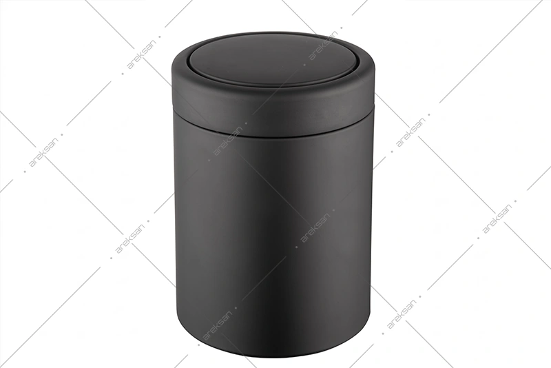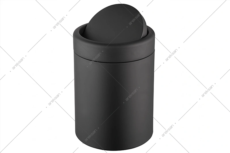 Siyah döner kapaklı paslanmaz çelik çöp kovası, DK103 modelinin elektrostatik siyah boyalı versiyonudur. Gövde ve kapak paslanmaz çelikten üretilmekte, dış yüzey elektrostatik toz boya yöntemiyle siyah renge boyanmaktadır. Otel odaları ve kurumsal iç mekanlarda koyu renk uyumlu dekorasyon projelerinde tercih edilen bu siyah döner kapaklı paslanmaz çelik çöp kovası, DK103 serisiyle aynı teknik özelliklere sahiptir.