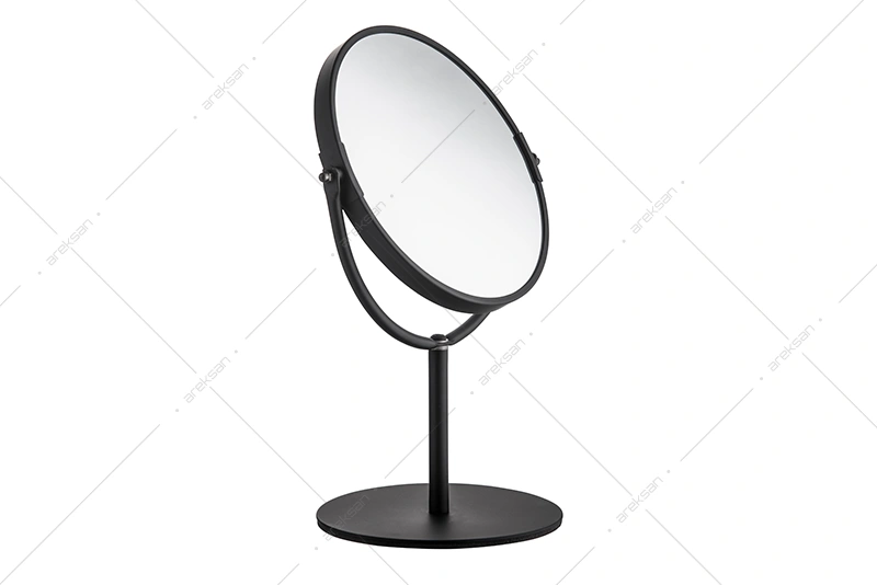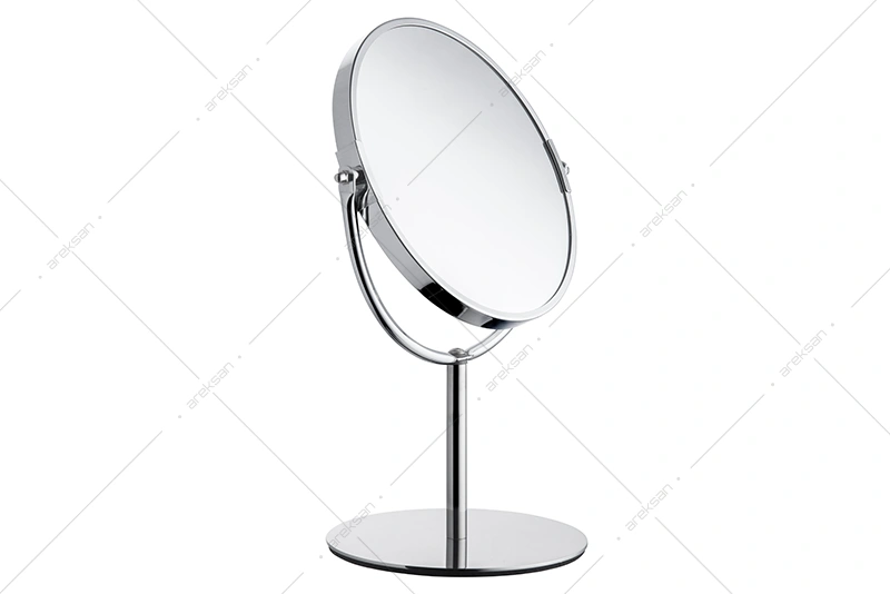 Tezgah üstü makyaj aynası olarak bu modelin teknik avantajı, çift taraflı ayna sistemi sayesinde normal ve büyütülmüş görüntü sunması ve tezgah tabanı sayesinde kaymaz, stabil montaj sağlamasıdır. Paslanmaz çelik yapı, döner mekanizma sistemi, yoğun kullanıma uygun dayanıklı tasarım sağlar. Ayna çapı 190 mm olup, bir tarafı 3x zoom detaylı inceleme, diğer tarafı düz görüntü sunmaktadır. Taban keçe malzeme ile korunmuş olup, tezgah yüzeyini koruyarak kaymaz tutunma garantiler. Tüm modeller istenilen renk ve yüzey seçenekleriyle proje bazlı üretilmektedir.
