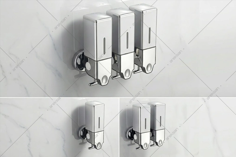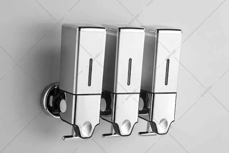 Üçlü çekmeli manuel sıvı sabun dispenseri, otel banyoları ve kurumsal tesis tuvaletlerinde sıvı sabun kullanımına yönelik 3×500 mL kapasiteli bir dispenserdir. GS600T, ABS plastik üst gövde ve 304 kalite paslanmaz çelik alt kısım kombinasyonuyla üç bağımsız haznede farklı ürün sunumu imkanı sağlar.